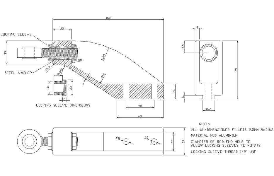 Relying on the geometric accuracy of the suspension mounting points leaves no adjustment options. So I designed (with Graham Hathaway's help) and had fabricated a set of adjustable top wishbones. You can buy these off the shelf, but you have to remove them to adjust them, not good. My design allows for camber adjustment in-situ.